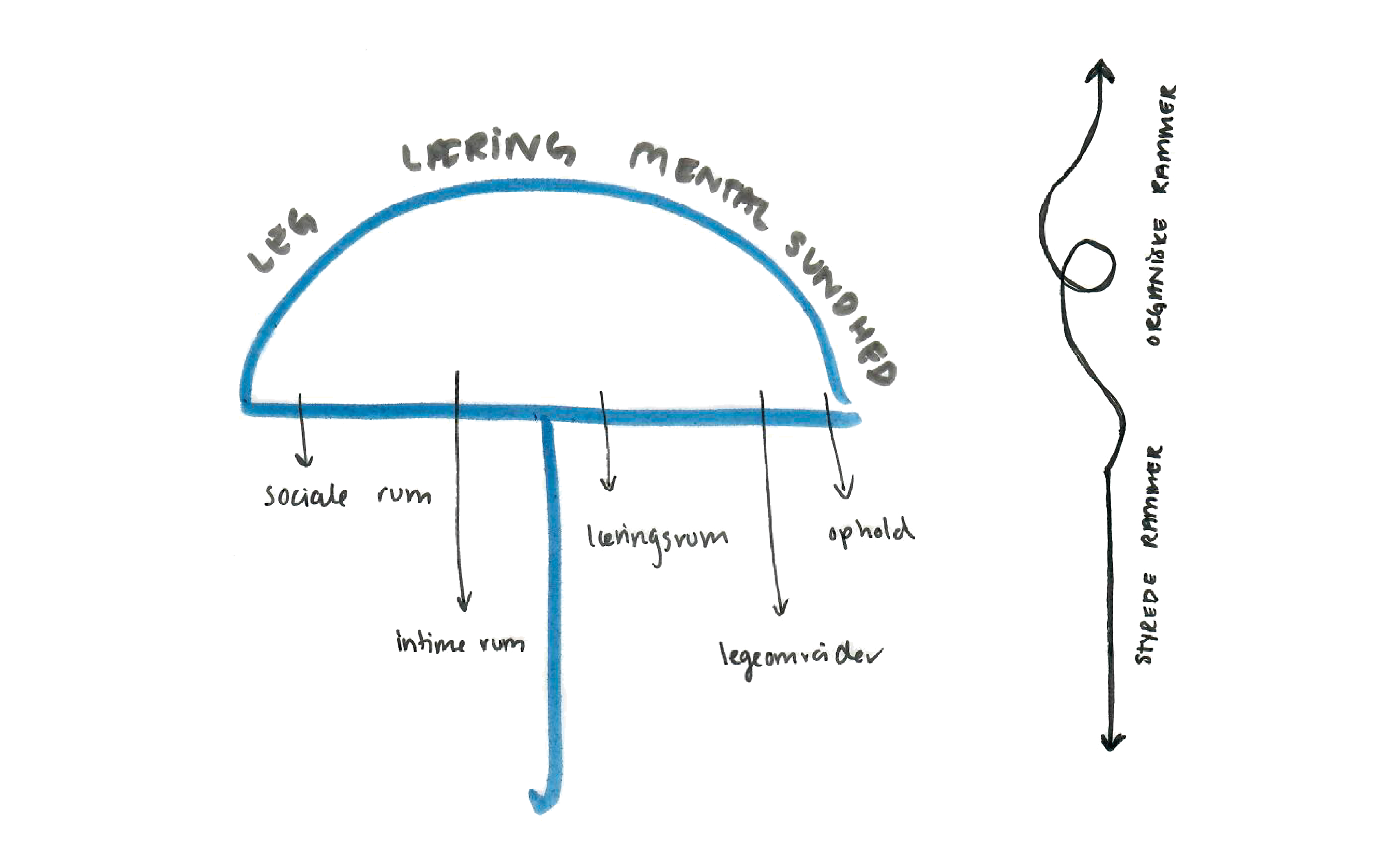 Det overordnede fokus er Leg, Læring og Mental sundhed, og disse tre punkter fremmes gennem sociale rum, intime rum, læringsrum, legeområder og rum bare til ophold. Det er desuden vigtigt, at rummene varierer fra organiske til mere styrede og kontrollerede rammer.