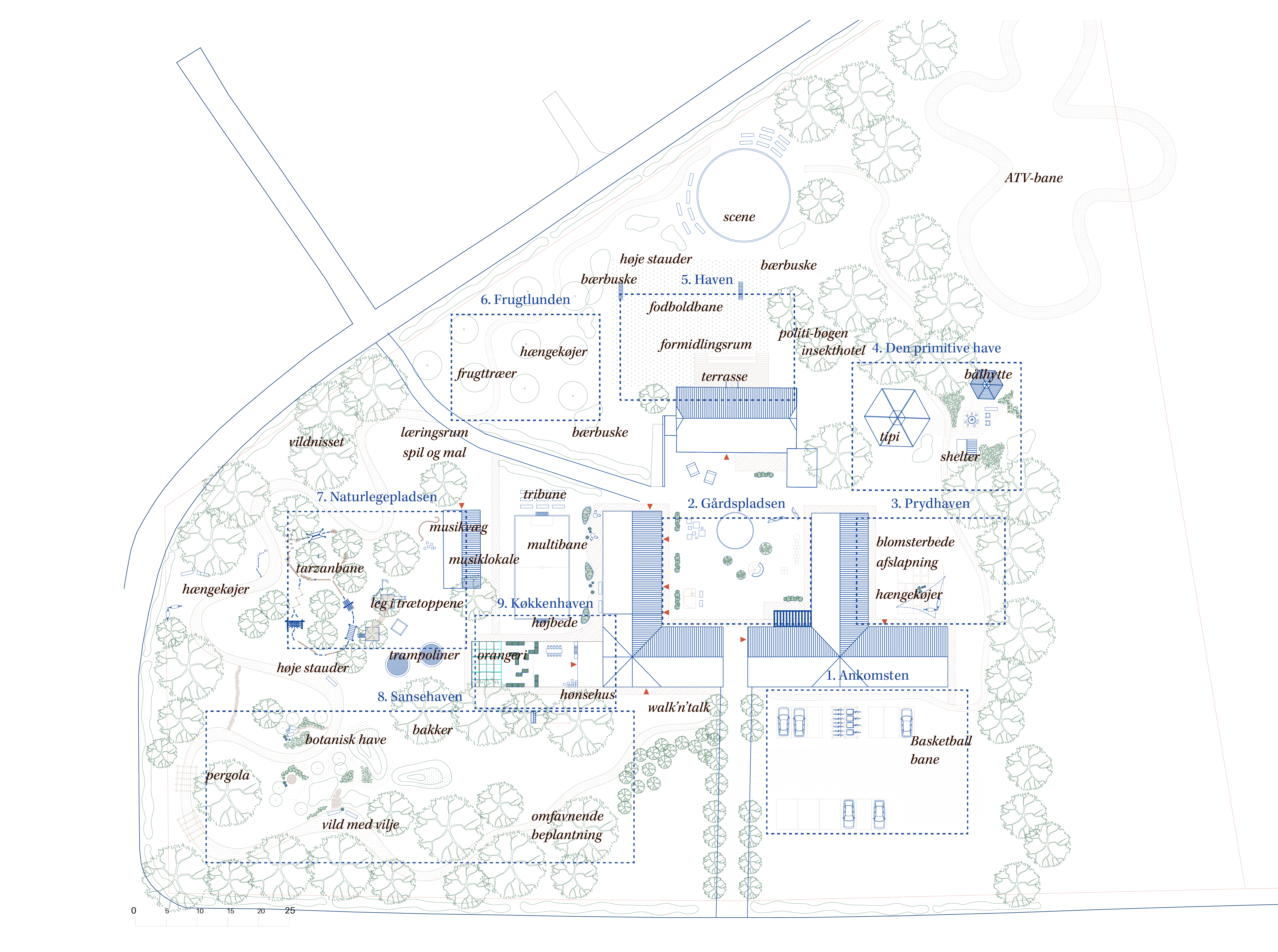 Masterplanen er inddelt i forskellige zoner, som giver områderne identitet og gør det nemmere for brugerne at orientere sig på ejendommen. De forskellige zoner sikrer en bred vifte af udendørs rum, som kan anvendes på forskellige måder både i læringssituationer og til leg
